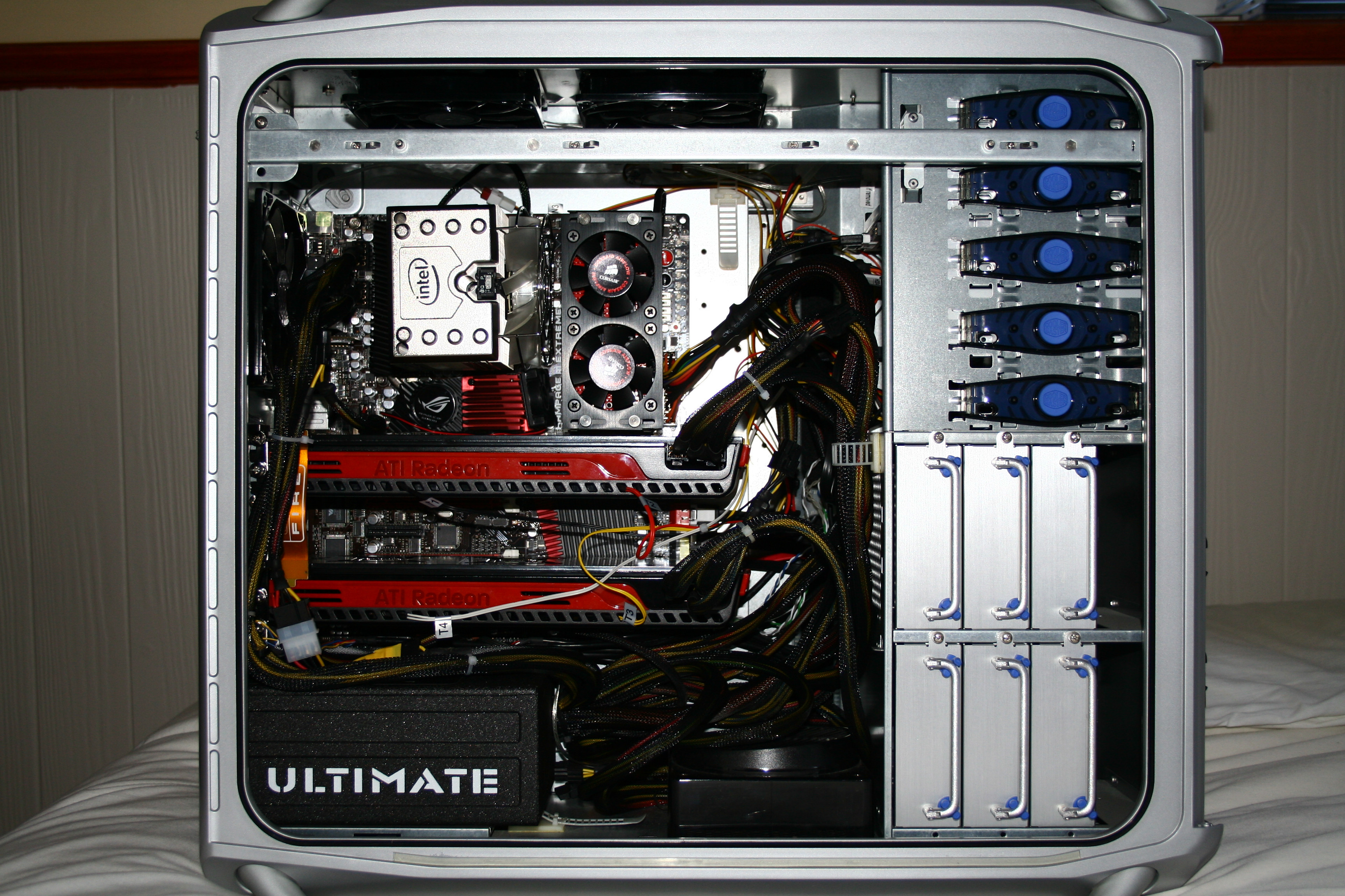 The original build in a CoolerMaster Cosmos case, with two ATI HD 5970's fitted